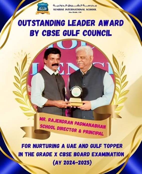 Congratulations to our Principal on receiving the Outstanding Leader Award from CBSE Gulf Council for nurturing a Gulf Topper – a proud moment for Sunrise International School, Abu Dhabi.Congratulations to